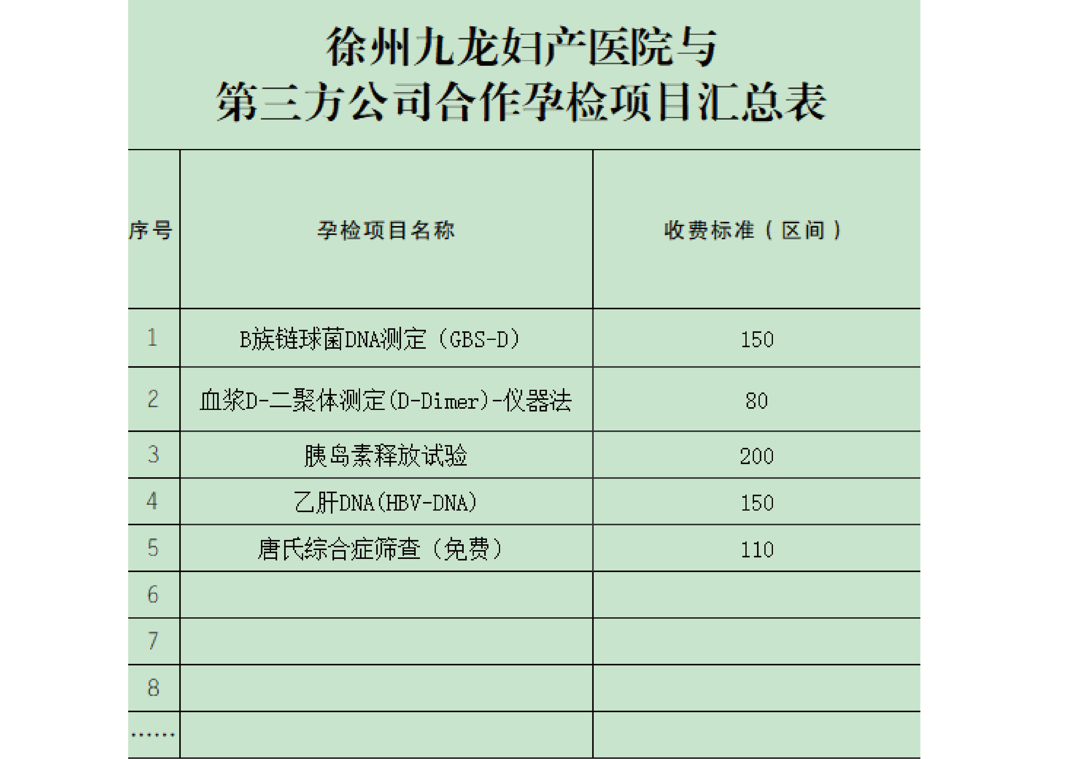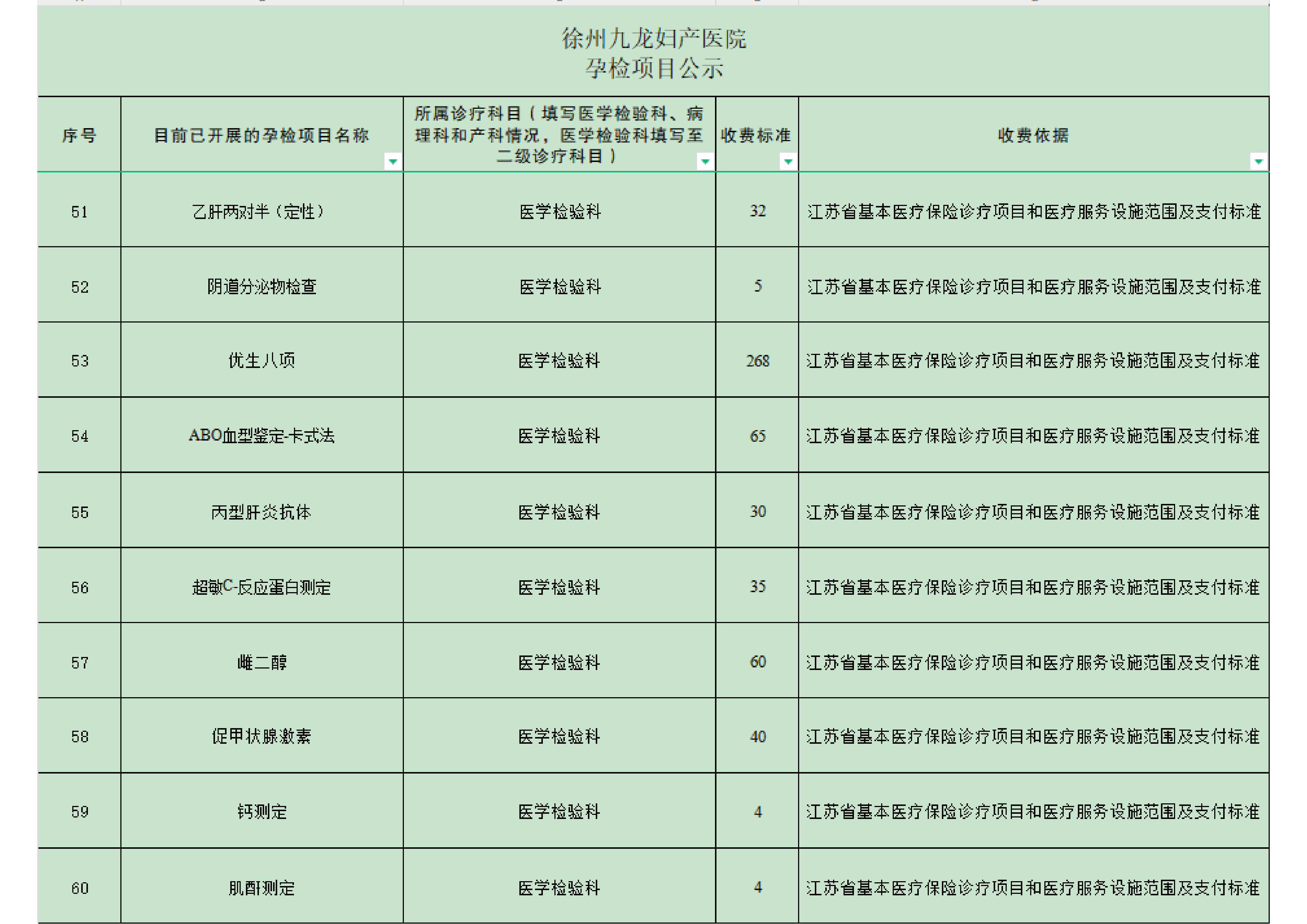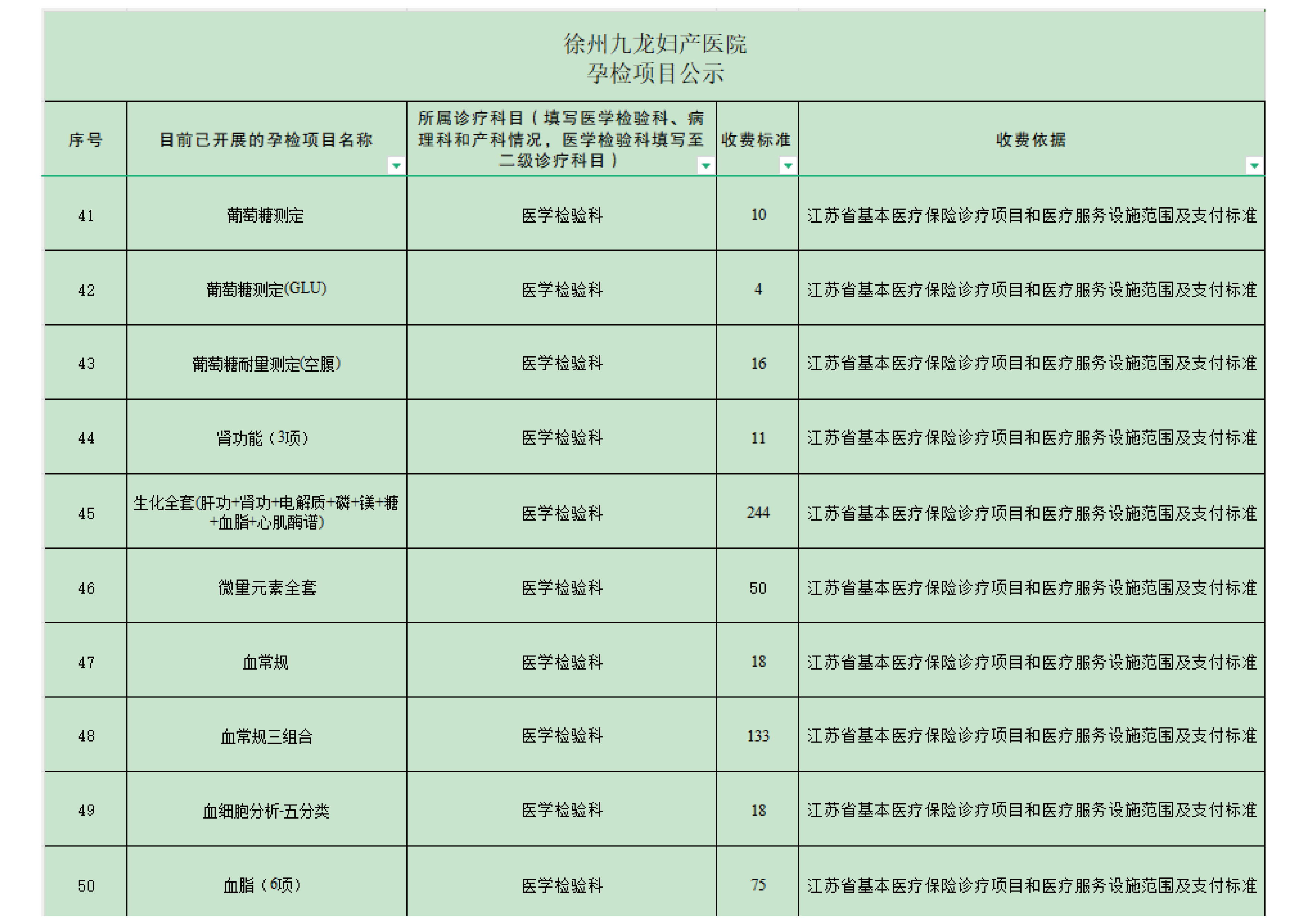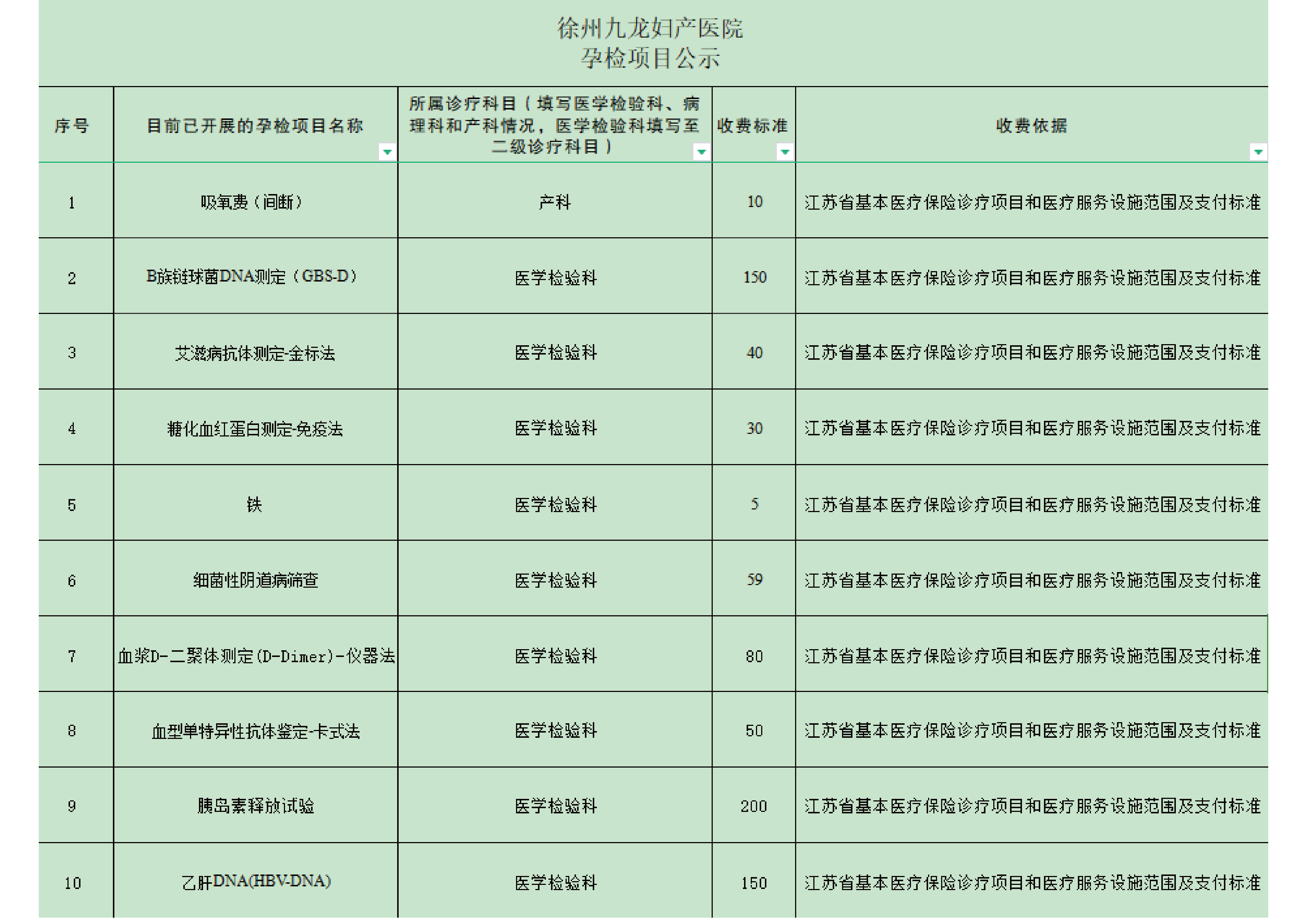徐州九龙妇产医院孕检费用自查表