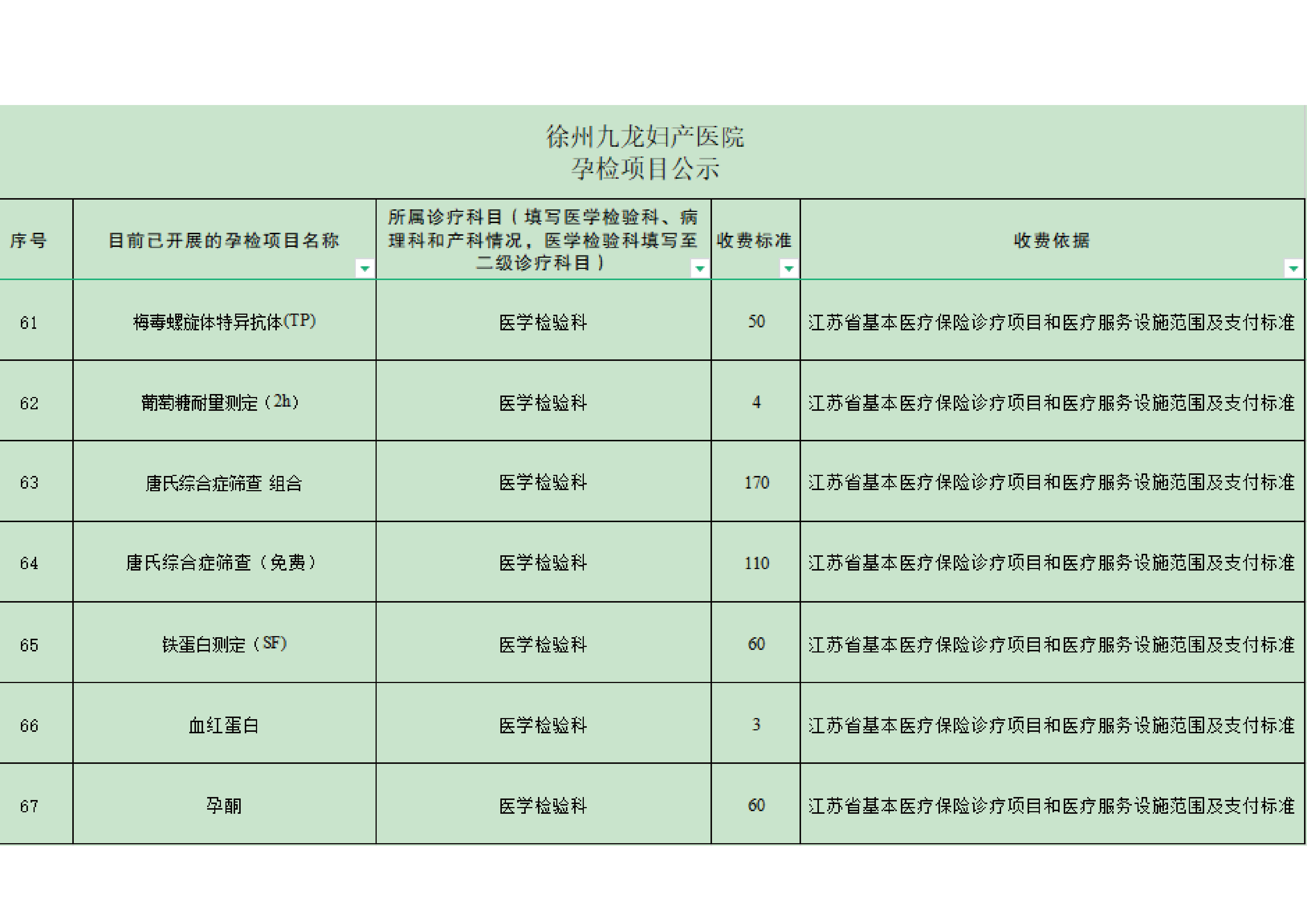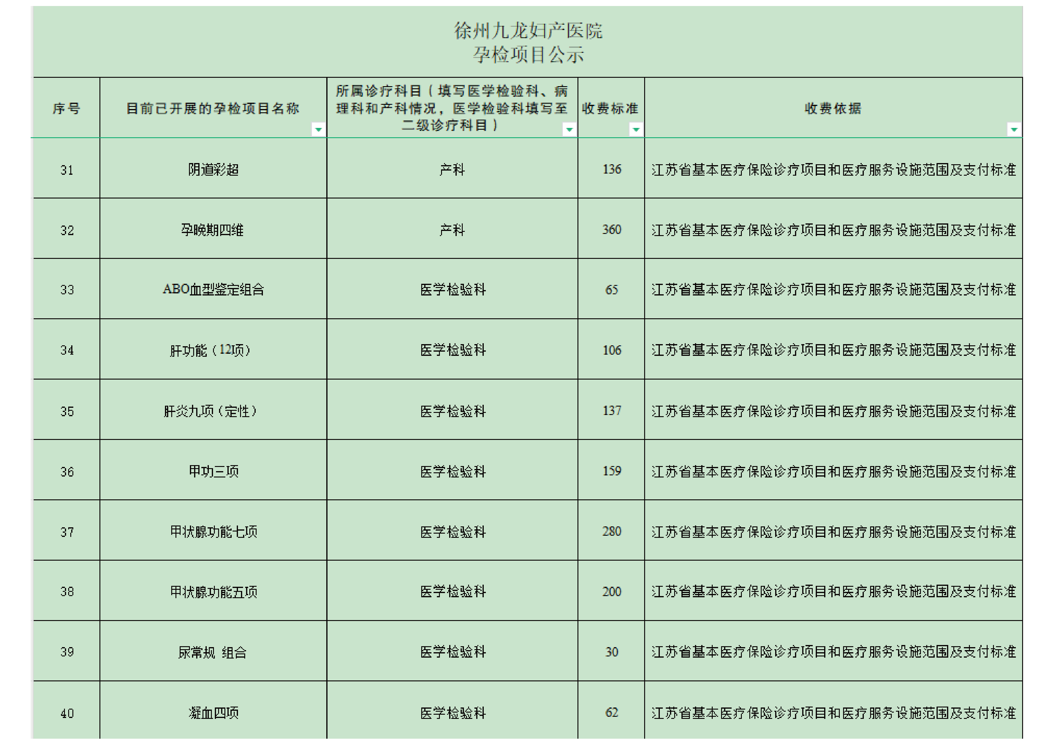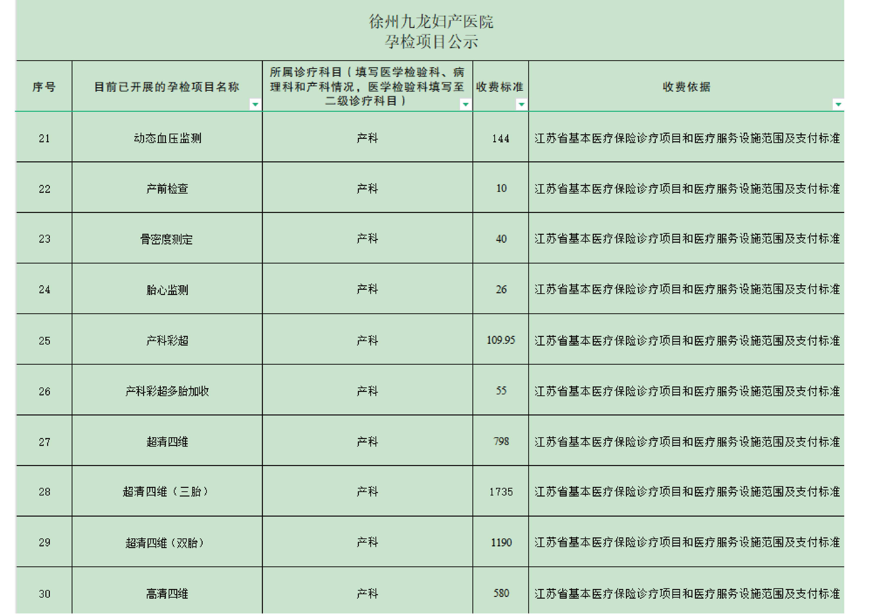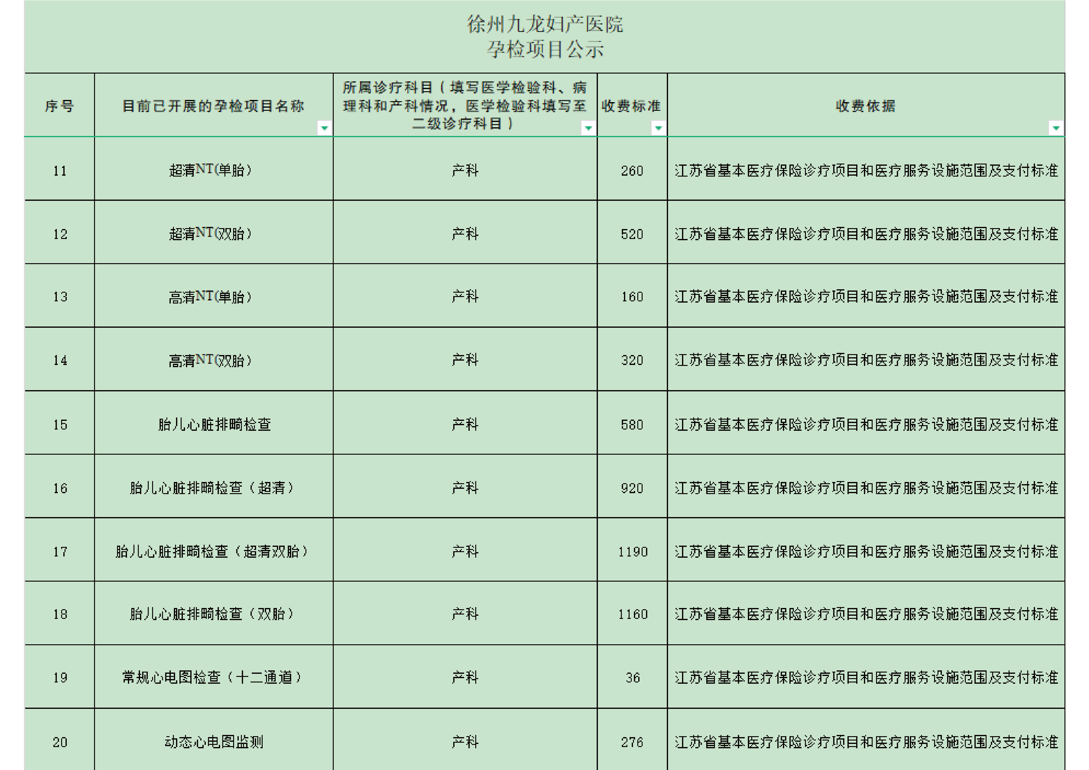 徐州九龙妇产医院孕检费用自查表